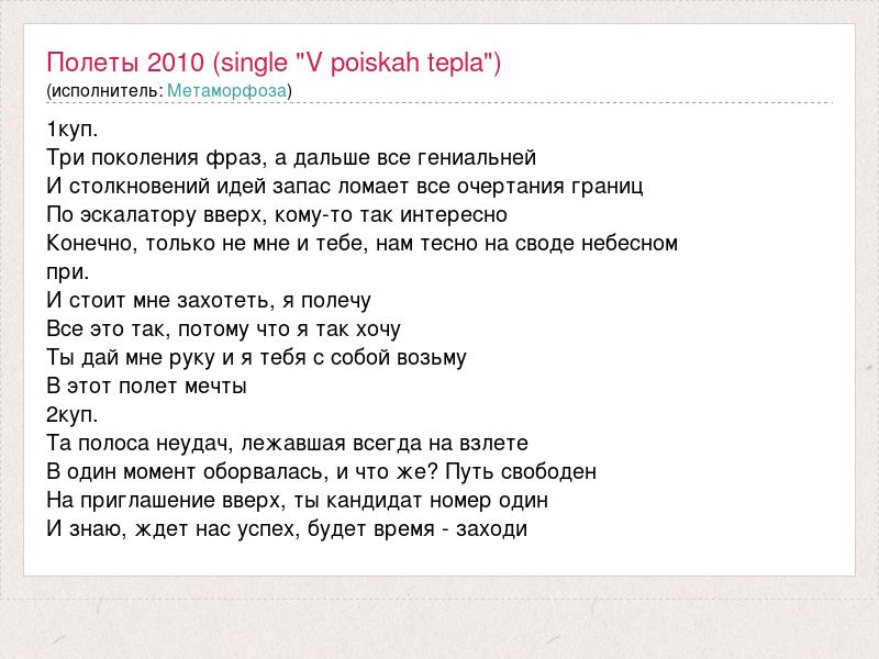 1куп. Три поколения фраз, а дальше все гениальней И столкновений идей запас ломает все очертания границ По эскалатору вверх, кому-то так интересно Конечно, только не мне и тебе, нам тесно на своде небесном при. И стоит мне захотеть, я полечу Все это так, потому что я так хочу Ты дай мне руку и я тебя с собой возьму В этот полет мечты 2куп. Та полоса неудач, лежавшая всегда на взлете В один момент оборвалась, и что же? Путь свободен На приглашение вверх, ты кандидат номер один И знаю, ждет нас успех, будет время - заходи
