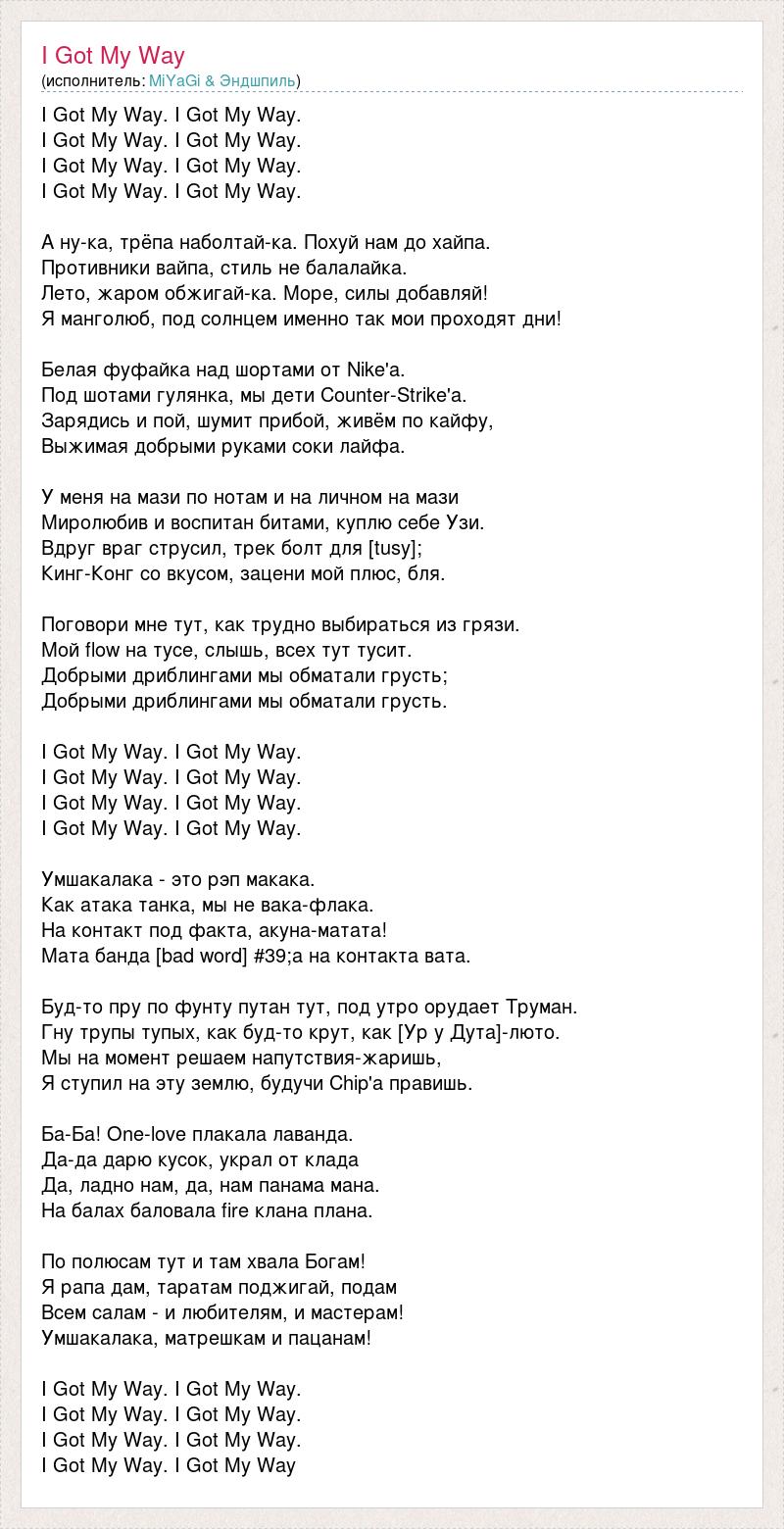 I Got My Way. I Got My Way. I Got My Way. I Got My Way. I Got My Way. I Got My Way. I Got My Way. I Got My Way. А ну-ка, трёпа наболтай-ка. Похуй нам до хайпа. Противники вайпа, стиль не балалайка. Лето, жаром обжигай-ка. Море, силы добавляй! Я манголюб, под солнцем именно так мои проходят дни! Белая фуфайка над шортами от Nike'а. Под шотами гулянка, мы дети Counter-Strike'а. Зарядись и пой, шумит прибой, живём по кайфу, Выжимая добрыми руками соки лайфа. У меня на мази по нотам и на личном на мази Миролюбив и воспитан битами, куплю себе Узи. Вдруг враг струсил, трек болт для [tusy]; Кинг-Конг со вкусом, зацени мой плюс, бля. Поговори мне тут, как трудно выбираться из грязи. Мой flow на тусе, слышь, всех тут тусит. Добрыми дриблингами мы обматали грусть; Добрыми дриблингами мы обматали грусть. I Got My Way. I Got My Way. I Got My Way. I Got My Way. I Got My Way. I Got My Way. I Got My Way. I Got My Way. Умшакалака - это рэп макака. Как атака танка, мы не вака-флака. На контакт под факта, акуна-матата! Мата банда [bad word] #39;а на контакта вата. Буд-то пру по фунту путан тут, под утро орудает Труман. Гну трупы тупых, как буд-то крут, как [Ур у Дута]-люто. Мы на момент решаем напутствия-жаришь, Я ступил на эту землю, будучи Chip'а правишь. Ба-Ба! One-love плакала лаванда. Да-да дарю кусок, украл от клада Да, ладно нам, да, нам панама мана. На балах баловала fire клана плана. По полюсам тут и там хвала Богам! Я рапа дам, таратам поджигай, подам Всем салам - и любителям, и мастерам! Умшакалака, матрешкам и пацанам! I Got My Way. I Got My Way. I Got My Way. I Got My Way. I Got My Way. I Got My Way. I Got My Way. I Got My Way