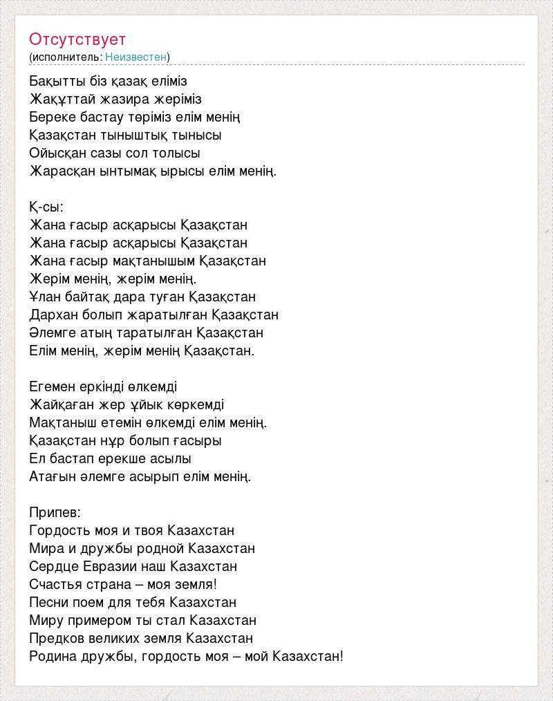 Бақытты біз қазақ еліміз Жақұттай жазира жеріміз Береке бастау төріміз елім менің Қазақстан тыныштық тынысы Ойысқан сазы сол толысы Жарасқан ынтымақ ырысы елім менің. Қ-сы: Жана ғасыр асқарысы Қазақстан Жана ғасыр асқарысы Қазақстан Жана ғасыр мақтанышым Қазақстан Жерім менің, жерім менің. Ұлан байтақ дара туған Қазақстан Дархан болып жаратылған Қазақстан Әлемге атың таратылған Қазақстан Елім менің, жерім менің Қазақстан. Егемен еркінді өлкемді Жайқаған жер ұйык көркемді Мақтаныш етемін өлкемді елім менің. Қазақстан нұр болып ғасыры Ел бастап ерекше асылы Атағын әлемге асырып елім менің. Припев: Гордость моя и твоя Казахстан Мира и дружбы родной Казахстан Сердце Евразии наш Казахстан Счастья страна – моя земля! Песни поем для тебя Казахстан Миру примером ты стал Казахстан Предков великих земля Казахстан Родина дружбы, гордость моя – мой Казахстан!