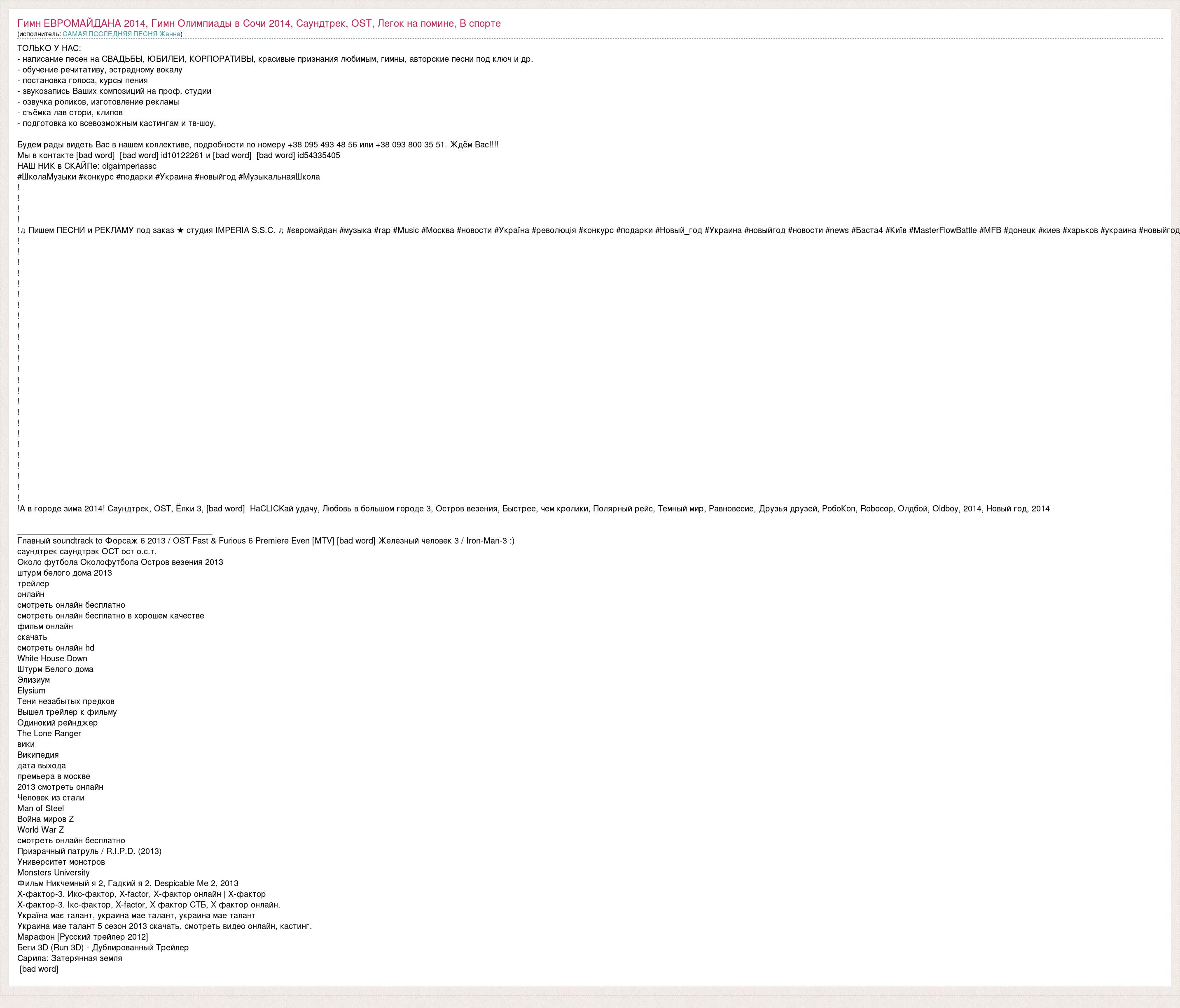 ТОЛЬКО У НАС: - написание песен на СВАДЬБЫ, ЮБИЛЕИ, КОРПОРАТИВЫ, красивые признания любимым, гимны, авторские песни под ключ и др. - обучение речитативу, эстрадному вокалу - постановка голоса, курсы пения - звукозапись Ваших композиций на проф. студии - озвучка роликов, изготовление рекламы - съёмка лав стори, клипов - подготовка ко всевозможным кастингам и тв-шоу. Будем рады видеть Вас в нашем коллективе, подробности по номеру +38 095 493 48 56 или +38 093 800 35 51. Ждём Вас!!!! Мы в контакте [bad word] [bad word] id10122261 и [bad word] [bad word] id54335405 НАШ НИК в СКАЙПе: olgaimperiassc #ШколаМузыки #конкурс #подарки #Украина #новыйгод #МузыкальнаяШкола ! ! ! ! !♫ Пишем ПЕСНИ и РЕКЛАМУ под заказ ★ студия IMPERIA S.S.C. ♫ #євромайдан #музыка #rap #Music #Москва #новости #Україна #революція #конкурс #подарки #Новый_год #Украина #новыйгод #новости #news #Баста4 #Київ #MasterFlowBattle #MFB #донецк #киев #харьков #украина #новыйгод ! ! ! ! ! ! ! ! ! ! ! ! ! ! ! ! ! ! ! ! ! ! ! ! ! !А в городе зима 2014! Саундтрек, OST, Ёлки 3, [bad word] НаCLICKай удачу, Любовь в большом городе 3, Остров везения, Быстрее, чем кролики, Полярный рейс, Темный мир, Равновесие, Друзья друзей, РобоКоп, Robocop, Олдбой, Oldboy, 2014, Новый год, 2014 ___________________________________________ Главный soundtrack to Форсаж 6 2013 / OST Fast & Furious 6 Premiere Even [MTV] [bad word] Железный человек 3 / Iron-Man-3 :) саундтрек саундтрэк ОСТ ост о.с.т. Около футбола Околофутбола Остров везения 2013 штурм белого дома 2013 трейлер онлайн смотреть онлайн бесплатно смотреть онлайн бесплатно в хорошем качестве фильм онлайн скачать смотреть онлайн hd White House Down Штурм Белого дома Элизиум Elysium Тени незабытых предков Вышел трейлер к фильму Одинокий рейнджер The Lone Ranger вики Википедия дата выхода премьера в москве 2013 смотреть онлайн Человек из стали Man of Steel Война миров Z World War Z смотреть онлайн бесплатно Призрачный патруль / R.I.P.D. (2013) Университет монстров Monsters University Фильм Никчемный я 2, Гадкий я 2, Despicable Me 2, 2013 Х-фактор-3. Икс-фактор, X-factor, Х-фактор онлайн | Х-фактор Х-фактор-3. Ікс-фактор, X-factor, Х фактор СТБ, Х фактор онлайн. Україна має талант, украина мае талант, украина мае талант Украина мае талант 5 сезон 2013 скачать, смотреть видео онлайн, кастинг. Марафон [Русский трейлер 2012] Беги 3D (Run 3D) - Дублированный Трейлер Сарила: Затерянная земля [bad word]