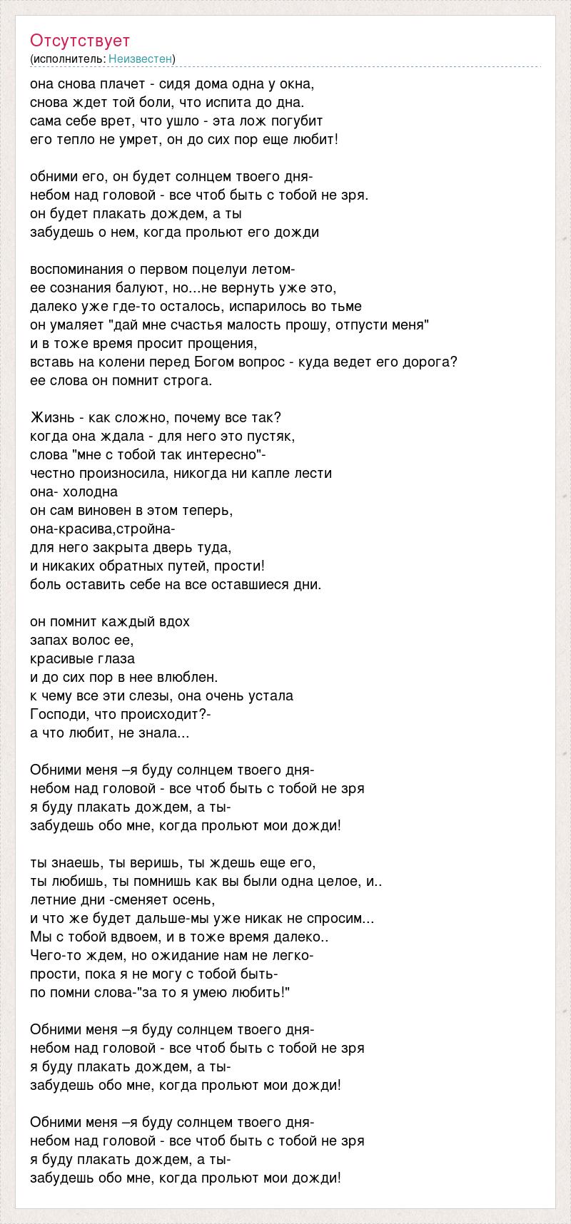 она снова плачет - сидя дома одна у окна, снова ждет той боли, что испита до дна. сама себе врет, что ушло - эта лож погубит его тепло не умрет, он до сих пор еще любит! обними его, он будет солнцем твоего дня- небом над головой - все чтоб быть с тобой не зря. он будет плакать дождем, а ты забудешь о нем, когда прольют его дожди воспоминания о первом поцелуи летом- ее сознания балуют, но...не вернуть уже это, далеко уже где-то осталось, испарилось во тьме он умаляет "дай мне счастья малость прошу, отпусти меня" и в тоже время просит прощения, вставь на колени перед Богом вопрос - куда ведет его дорога? ее слова он помнит строга. Жизнь - как сложно, почему все так? когда она ждала - для него это пустяк, слова "мне с тобой так интересно"- честно произносила, никогда ни капле лести она- холодна он сам виновен в этом теперь, она-красива,стройна- для него закрыта дверь туда, и никаких обратных путей, прости! боль оставить себе на все оставшиеся дни. он помнит каждый вдох запах волос ее, красивые глаза и до сих пор в нее влюблен. к чему все эти слезы, она очень устала Господи, что происходит?- а что любит, не знала... Обними меня –я буду солнцем твоего дня- небом над головой - все чтоб быть с тобой не зря я буду плакать дождем, а ты- забудешь обо мне, когда прольют мои дожди! ты знаешь, ты веришь, ты ждешь еще его, ты любишь, ты помнишь как вы были одна целое, и.. летние дни -сменяет осень, и что же будет дальше-мы уже никак не спросим... Мы с тобой вдвоем, и в тоже время далеко.. Чего-то ждем, но ожидание нам не легко- прости, пока я не могу с тобой быть- по помни слова-"за то я умею любить!" Обними меня –я буду солнцем твоего дня- небом над головой - все чтоб быть с тобой не зря я буду плакать дождем, а ты- забудешь обо мне, когда прольют мои дожди! Обними меня –я буду солнцем твоего дня- небом над головой - все чтоб быть с тобой не зря я буду плакать дождем, а ты- забудешь обо мне, когда прольют мои дожди!