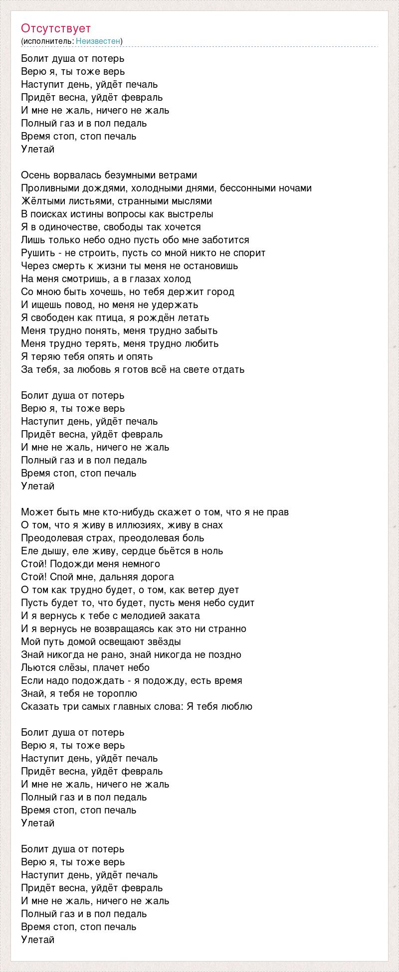 Болит душа от потерь Верю я, ты тоже верь Наступит день, уйдёт печаль Придёт весна, уйдёт февраль И мне не жаль, ничего не жаль Полный газ и в пол педаль Время стоп, стоп печаль Улетай Осень ворвалась безумными ветрами Проливными дождями, холодными днями, бессонными ночами Жёлтыми листьями, странными мыслями В поисках истины вопросы как выстрелы Я в одиночестве, свободы так хочется Лишь только небо одно пусть обо мне заботится Рушить - не строить, пусть со мной никто не спорит Через смерть к жизни ты меня не остановишь На меня смотришь, а в глазах холод Со мною быть хочешь, но тебя держит город И ищешь повод, но меня не удержать Я свободен как птица, я рождён летать Меня трудно понять, меня трудно забыть Меня трудно терять, меня трудно любить Я теряю тебя опять и опять За тебя, за любовь я готов всё на свете отдать Болит душа от потерь Верю я, ты тоже верь Наступит день, уйдёт печаль Придёт весна, уйдёт февраль И мне не жаль, ничего не жаль Полный газ и в пол педаль Время стоп, стоп печаль Улетай Может быть мне кто-нибудь скажет о том, что я не прав О том, что я живу в иллюзиях, живу в снах Преодолевая страх, преодолевая боль Еле дышу, еле живу, сердце бьётся в ноль Стой! Подожди меня немного Стой! Спой мне, дальняя дорога О том как трудно будет, о том, как ветер дует Пусть будет то, что будет, пусть меня небо судит И я вернусь к тебе с мелодией заката И я вернусь не возвращаясь как это ни странно Мой путь домой освещают звёзды Знай никогда не рано, знай никогда не поздно Льются слёзы, плачет небо Если надо подождать - я подожду, есть время Знай, я тебя не тороплю Сказать три самых главных слова: Я тебя люблю Болит душа от потерь Верю я, ты тоже верь Наступит день, уйдёт печаль Придёт весна, уйдёт февраль И мне не жаль, ничего не жаль Полный газ и в пол педаль Время стоп, стоп печаль Улетай Болит душа от потерь Верю я, ты тоже верь Наступит день, уйдёт печаль Придёт весна, уйдёт февраль И мне не жаль, ничего не жаль Полный газ и в пол педаль Время стоп, стоп печаль Улетай