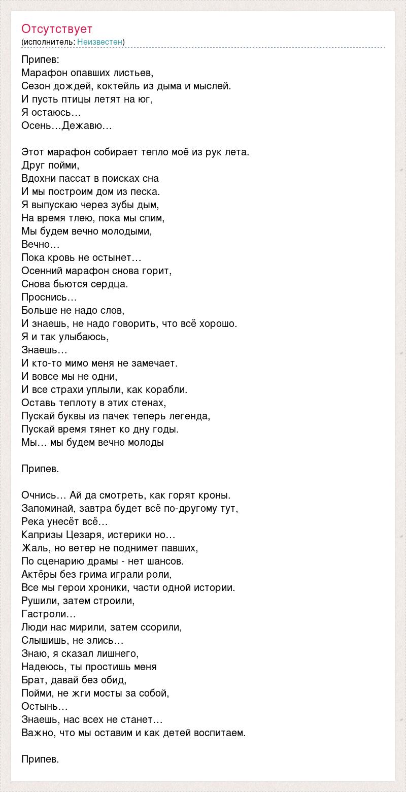 Припев: Марафон опавших листьев, Сезон дождей, коктейль из дыма и мыслей. И пусть птицы летят на юг, Я остаюсь… Осень…Дежавю… Этот марафон собирает тепло моё из рук лета. Друг пойми, Вдохни пассат в поисках сна И мы построим дом из песка. Я выпускаю через зубы дым, На время тлею, пока мы спим, Мы будем вечно молодыми, Вечно… Пока кровь не остынет… Осенний марафон снова горит, Снова бьются сердца. Проснись… Больше не надо слов, И знаешь, не надо говорить, что всё хорошо. Я и так улыбаюсь, Знаешь… И кто-то мимо меня не замечает. И вовсе мы не одни, И все страхи уплыли, как корабли. Оставь теплоту в этих стенах, Пускай буквы из пачек теперь легенда, Пускай время тянет ко дну годы. Мы… мы будем вечно молоды Припев. Очнись… Ай да смотреть, как горят кроны. Запоминай, завтра будет всё по-другому тут, Река унесёт всё… Капризы Цезаря, истерики но… Жаль, но ветер не поднимет павших, По сценарию драмы - нет шансов. Актёры без грима играли роли, Все мы герои хроники, части одной истории. Рушили, затем строили, Гастроли… Люди нас мирили, затем ссорили, Слышишь, не злись… Знаю, я сказал лишнего, Надеюсь, ты простишь меня Брат, давай без обид, Пойми, не жги мосты за собой, Остынь… Знаешь, нас всех не станет… Важно, что мы оставим и как детей воспитаем. Припев.
