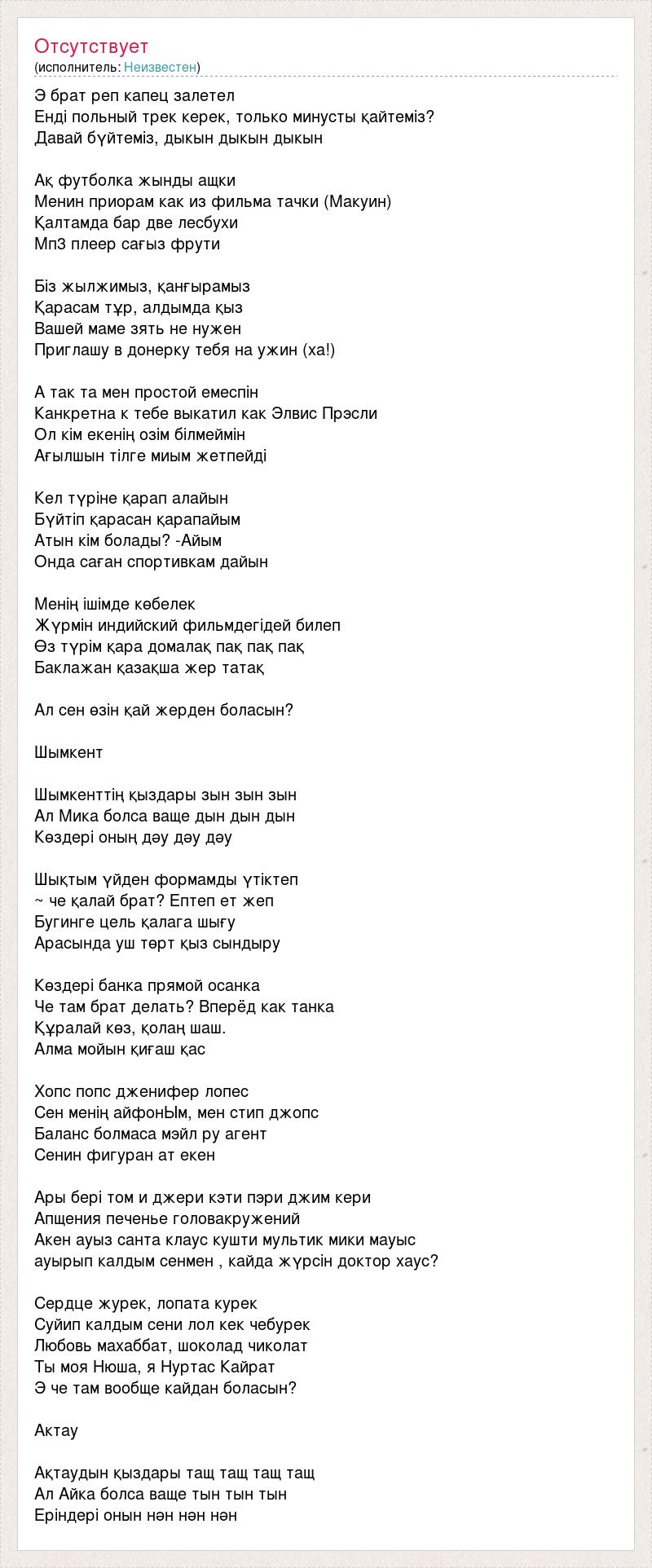 Э брат реп капец залетел Енді польный трек керек, только минусты қайтеміз? Давай бүйтеміз, дыкын дыкын дыкын Ақ футболка жынды ащки Менин приорам как из фильма тачки (Макуин) Қалтамда бар две лесбухи Мп3 плеер сағыз фрути Біз жылжимыз, қанғырамыз Қарасам тұр, алдымда қыз Вашей маме зять не нужен Приглашу в донерку тебя на ужин (ха!) А так та мен простой емеспін Канкретна к тебе выкатил как Элвис Прэсли Ол кім екенің озім білмеймін Ағылшын тілге миым жетпейді Кел түріне қарап алайын Бүйтіп қарасан қарапайым Атын кім болады? -Айым Онда саған спортивкам дайын Менің ішімде көбелек Жүрмін индийский фильмдегідей билеп Өз түрім қара домалақ пақ пақ пақ Баклажан қазақша жер татақ Ал сен өзін қай жерден боласын? Шымкент Шымкенттің қыздары зын зын зын Ал Мика болса ваще дын дын дын Көздері оның дәу дәу дәу Шықтым үйден формамды үтіктеп ~ че қалай брат? Ептеп ет жеп Бугинге цель қалага шығу Арасында уш төрт қыз сындыру Көздері банка прямой осанка Че там брат делать? Вперёд как танка Құралай көз, қолаң шаш. Алма мойын қиғаш қас Хопс попс дженифер лопес Сен менің айфонЫм, мен стип джопс Баланс болмаса мэйл ру агент Сенин фигуран ат екен Ары бері том и джери кэти пэри джим кери Апщения печенье головакружений Акен ауыз санта клаус кушти мультик мики мауыс ауырып калдым сенмен , кайда жүрсін доктор xаус? Сердце журек, лопата курек Суйип калдым сени лол кек чебурек Любовь махаббат, шоколад чиколат Ты моя Нюша, я Нуртас Кайрат Э че там вообще кайдан боласын? Актау Ақтаудын қыздары тащ тащ тащ тащ Ал Айка болса ваще тын тын тын Еріндері онын нән нән нән