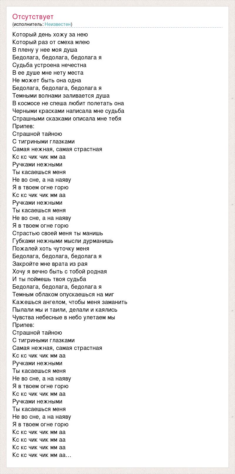 Который день хожу за нею Который раз от смеха млею В плену у нее моя душа Бедолага, бедолага, бедолага я Судьба устроена нечестна В ее душе мне нету места Не может быть она одна Бедолага, бедолага, бедолага я Темными волнами заливается душа В космосе не спеша любит полетать она Черными красками написала мне судьба Страшными сказками описала мне тебя Припев: Страшной тайною С тигриными глазками Самая нежная, самая страстная Кс кс чик чик мм аа Ручками нежными Ты касаешься меня Не во сне, а на наяву Я в твоем огне горю Кс кс чик чик мм аа Ручками нежными Ты касаешься меня Не во сне, а на наяву Я в твоем огне горю Страстью своей меня ты манишь Губками нежными мысли дурманишь Пожалей хоть чуточку меня Бедолага, бедолага, бедолага я Закройте мне врата из рая Хочу я вечно быть с тобой родная И ты поймешь твоя судьба Бедолага, бедолага, бедолага я Темным облаком опускаешься на миг Кажешься ангелом, чтобы меня заманить Пылали мы и таили, делали и каялись Чувства небесные в небо улетаем мы Припев: Страшной тайною С тигриными глазками Самая нежная, самая страстная Кс кс чик чик мм аа Ручками нежными Ты касаешься меня Не во сне, а на наяву Я в твоем огне горю Кс кс чик чик мм аа Ручками нежными Ты касаешься меня Не во сне, а на наяву Я в твоем огне горю Кс кс чик чик мм аа Кс кс чик чик мм аа Кс кс чик чик мм аа Кс кс чик чик мм аа…
