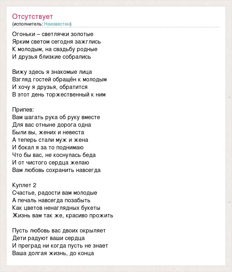 Огоньки – светлячки золотые Ярким светом сегодня зажглись К молодым, на свадьбу родные И друзья близкие собрались Вижу здесь я знакомые лица Взгляд гостей обращён к молодым И хочу я друзья, обратится В этот день торжественный к ним Припев: Вам шагать рука об руку вместе Для вас отныне дорога одна Были вы, жених и невеста А теперь стали муж и жена И бокал я за то поднимаю Что бы вас, не коснулась беда И от чистого сердца желаю Вам любовь сохранить навсегда Куплет 2 Счастье, радости вам молодые А печаль навсегда позабыть Как цветов ненаглядных букеты Жизнь вам так же, красиво прожить Пусть любовь вас двоих окрыляет Дети радуют ваши сердца И преград ни когда пусть не знает Ваша долгая жизнь, до конца