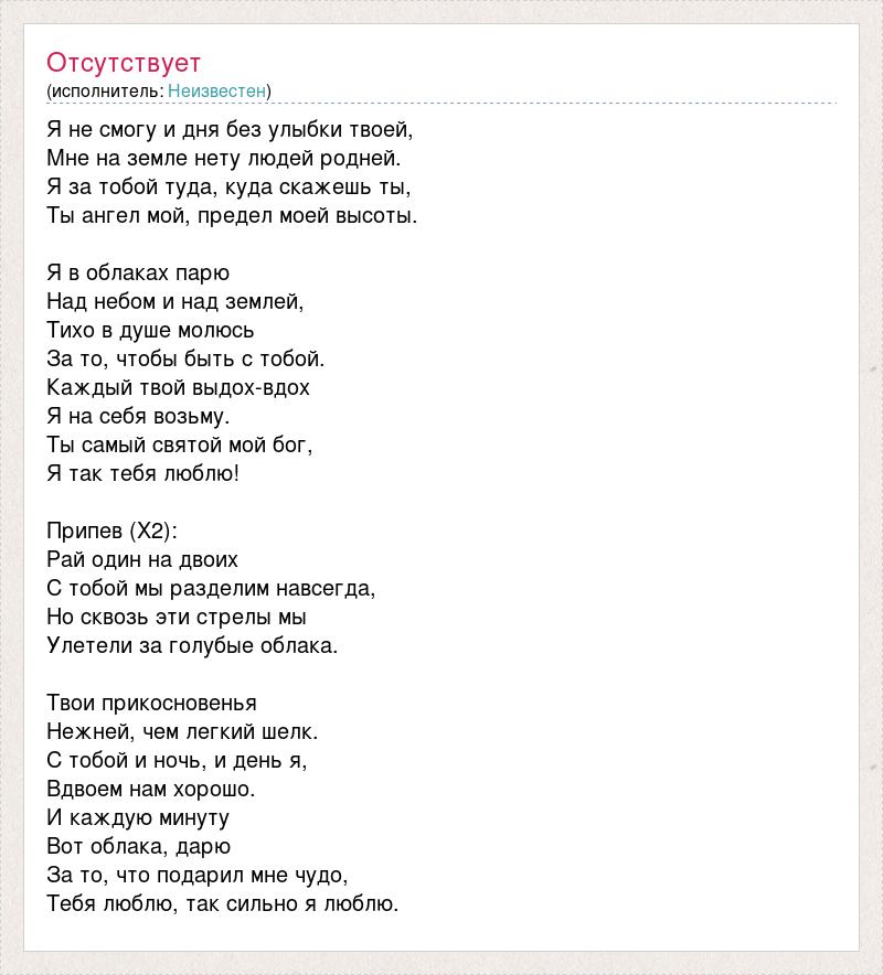 Я не смогу и дня без улыбки твоей, Мне на земле нету людей родней. Я за тобой туда, куда скажешь ты, Ты ангел мой, предел моей высоты. Я в облаках парю Над небом и над землей, Тихо в душе молюсь За то, чтобы быть с тобой. Каждый твой выдох-вдох Я на себя возьму. Ты самый святой мой бог, Я так тебя люблю! Припев (Х2): Рай один на двоих С тобой мы разделим навсегда, Но сквозь эти стрелы мы Улетели за голубые облака. Твои прикосновенья Нежней, чем легкий шелк. С тобой и ночь, и день я, Вдвоем нам хорошо. И каждую минуту Вот облака, дарю За то, что подарил мне чудо, Тебя люблю, так сильно я люблю.