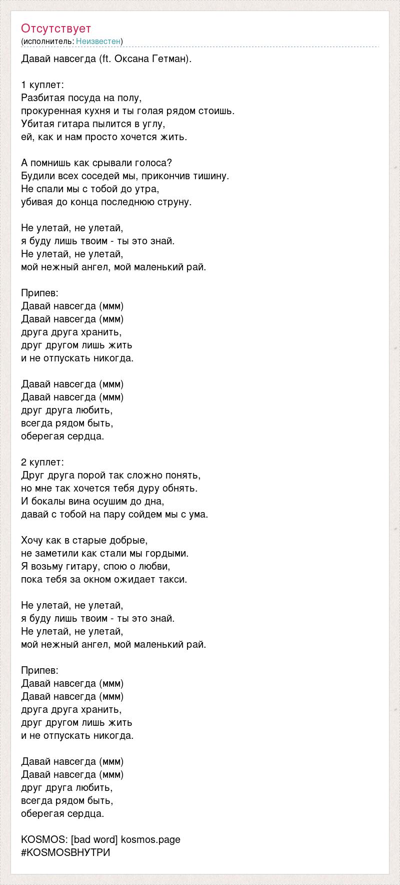 Давай навсегда (ft. Оксана Гетман). 1 куплет: Разбитая посуда на полу, прокуренная кухня и ты голая рядом стоишь. Убитая гитара пылится в углу, ей, как и нам просто хочется жить. А помнишь как срывали голоса? Будили всех соседей мы, прикончив тишину. Не спали мы с тобой до утра, убивая до конца последнюю струну. Не улетай, не улетай, я буду лишь твоим - ты это знай. Не улетай, не улетай, мой нежный ангел, мой маленький рай. Припев: Давай навсегда (ммм) Давай навсегда (ммм) друга друга хранить, друг другом лишь жить и не отпускать никогда. Давай навсегда (ммм) Давай навсегда (ммм) друг друга любить, всегда рядом быть, оберегая сердца. 2 куплет: Друг друга порой так сложно понять, но мне так хочется тебя дуру обнять. И бокалы вина осушим до дна, давай с тобой на пару сойдем мы с ума. Хочу как в старые добрые, не заметили как стали мы гордыми. Я возьму гитару, спою о любви, пока тебя за окном ожидает такси. Не улетай, не улетай, я буду лишь твоим - ты это знай. Не улетай, не улетай, мой нежный ангел, мой маленький рай. Припев: Давай навсегда (ммм) Давай навсегда (ммм) друга друга хранить, друг другом лишь жить и не отпускать никогда. Давай навсегда (ммм) Давай навсегда (ммм) друг друга любить, всегда рядом быть, оберегая сердца. KOSMOS: [bad word] kosmos.page #KOSMOSВНУТРИ