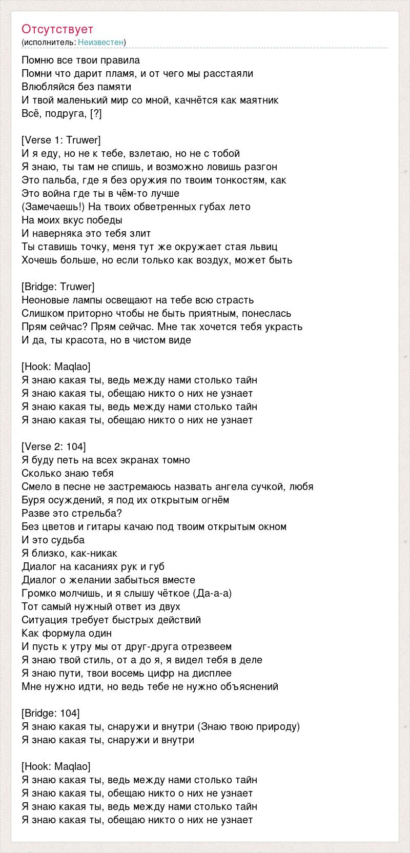 Помню все твои правила Помни что дарит пламя, и от чего мы расстаяли Влюбляйся без памяти И твой маленький мир со мной, качнётся как маятник Всё, подруга, [?] [Verse 1: Truwer] И я еду, но не к тебе, взлетаю, но не с тобой Я знаю, ты там не спишь, и возможно ловишь разгон Это пальба, где я без оружия по твоим тонкостям, как Это война где ты в чём-то лучше (Замечаешь!) На твоих обветренных губах лето На моих вкус победы И наверняка это тебя злит Ты ставишь точку, меня тут же окружает стая львиц Хочешь больше, но если только как воздух, может быть [Bridge: Truwer] Неоновые лампы освещают на тебе всю страсть Слишком приторно чтобы не быть приятным, понеслась Прям сейчас? Прям сейчас. Мне так хочется тебя украсть И да, ты красота, но в чистом виде [Hook: Maqlao] Я знаю какая ты, ведь между нами столько тайн Я знаю какая ты, обещаю никто о них не узнает Я знаю какая ты, ведь между нами столько тайн Я знаю какая ты, обещаю никто о них не узнает [Verse 2: 104] Я буду петь на всех экранах томно Сколько знаю тебя Смело в песне не застремаюсь назвать ангела сучкой, любя Буря осуждений, я под их открытым огнём Разве это стрельба? Без цветов и гитары качаю под твоим открытым окном И это судьба Я близко, как-никак Диалог на касаниях рук и губ Диалог о желании забыться вместе Громко молчишь, и я слышу чёткое (Да-а-а) Тот самый нужный ответ из двух Ситуация требует быстрых действий Как формула один И пусть к утру мы от друг-друга отрезвеем Я знаю твой стиль, от а до я, я видел тебя в деле Я знаю пути, твои восемь цифр на дисплее Мне нужно идти, но ведь тебе не нужно объяснений [Bridge: 104] Я знаю какая ты, снаружи и внутри (Знаю твою природу) Я знаю какая ты, снаружи и внутри [Hook: Maqlao] Я знаю какая ты, ведь между нами столько тайн Я знаю какая ты, обещаю никто о них не узнает Я знаю какая ты, ведь между нами столько тайн Я знаю какая ты, обещаю никто о них не узнает