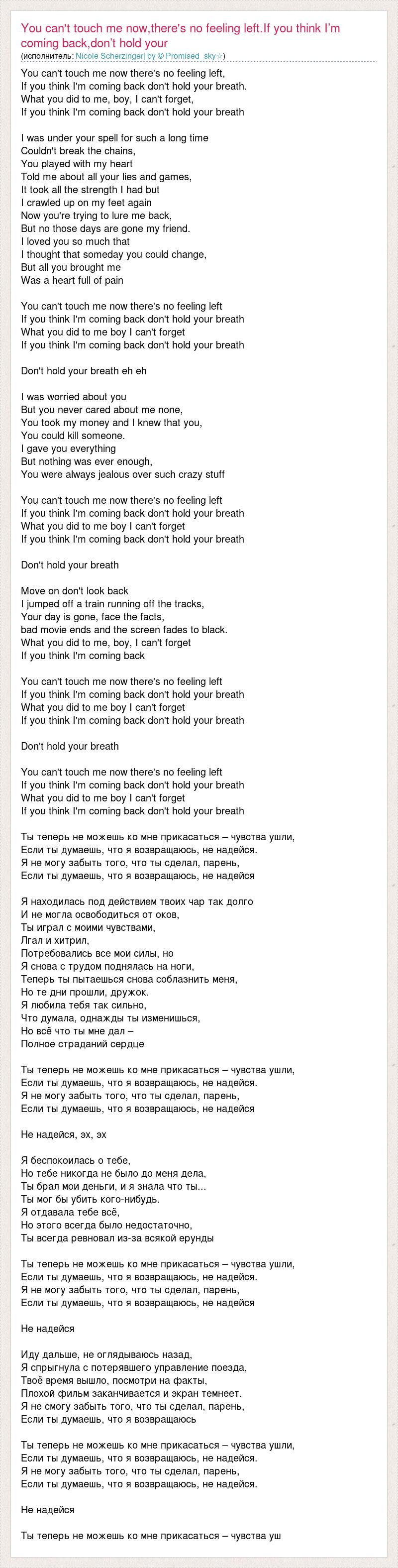 You can't touch me now there's no feeling left, If you think I'm coming back don't hold your breath. What you did to me, boy, I can't forget, If you think I'm coming back don't hold your breath I was under your spell for such a long time Couldn't break the chains, You played with my heart Told me about all your lies and games, It took all the strength I had but I crawled up on my feet again Now you're trying to lure me back, But no those days are gone my friend. I loved you so much that I thought that someday you could change, But all you brought me Was a heart full of pain You can't touch me now there's no feeling left If you think I'm coming back don't hold your breath What you did to me boy I can't forget If you think I'm coming back don't hold your breath Don't hold your breath eh eh I was worried about you But you never cared about me none, You took my money and I knew that you, You could kill someone. I gave you everything But nothing was ever enough, You were always jealous over such crazy stuff You can't touch me now there's no feeling left If you think I'm coming back don't hold your breath What you did to me boy I can't forget If you think I'm coming back don't hold your breath Don't hold your breath Move on don't look back I jumped off a train running off the tracks, Your day is gone, face the facts, bad movie ends and the screen fades to black. What you did to me, boy, I can't forget If you think I'm coming back You can't touch me now there's no feeling left If you think I'm coming back don't hold your breath What you did to me boy I can't forget If you think I'm coming back don't hold your breath Don't hold your breath You can't touch me now there's no feeling left If you think I'm coming back don't hold your breath What you did to me boy I can't forget If you think I'm coming back don't hold your breath Ты теперь не можешь ко мне прикасаться – чувства ушли, Если ты думаешь, что я возвращаюсь, не надейся. Я не могу забыть того, что ты сделал, парень, Если ты думаешь, что я возвращаюсь, не надейся Я находилась под действием твоих чар так долго И не могла освободиться от оков, Ты играл с моими чувствами, Лгал и хитрил, Потребовались все мои силы, но Я снова с трудом поднялась на ноги, Теперь ты пытаешься снова соблазнить меня, Но те дни прошли, дружок. Я любила тебя так сильно, Что думала, однажды ты изменишься, Но всё что ты мне дал – Полное страданий сердце Ты теперь не можешь ко мне прикасаться – чувства ушли, Если ты думаешь, что я возвращаюсь, не надейся. Я не могу забыть того, что ты сделал, парень, Если ты думаешь, что я возвращаюсь, не надейся Не надейся, эх, эх Я беспокоилась о тебе, Но тебе никогда не было до меня дела, Ты брал мои деньги, и я знала что ты... Ты мог бы убить кого-нибудь. Я отдавала тебе всё, Но этого всегда было недостаточно, Ты всегда ревновал из-за всякой ерунды Ты теперь не можешь ко мне прикасаться – чувства ушли, Если ты думаешь, что я возвращаюсь, не надейся. Я не могу забыть того, что ты сделал, парень, Если ты думаешь, что я возвращаюсь, не надейся Не надейся Иду дальше, не оглядываюсь назад, Я спрыгнула с потерявшего управление поезда, Твоё время вышло, посмотри на факты, Плохой фильм заканчивается и экран темнеет. Я не смогу забыть того, что ты сделал, парень, Если ты думаешь, что я возвращаюсь Ты теперь не можешь ко мне прикасаться – чувства ушли, Если ты думаешь, что я возвращаюсь, не надейся. Я не могу забыть того, что ты сделал, парень, Если ты думаешь, что я возвращаюсь, не надейся. Не надейся Ты теперь не можешь ко мне прикасаться – чувства уш