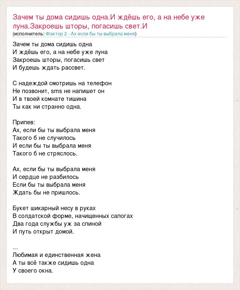 Главная→Исполнители→Фактор 2 - Ах если бы ты выбрала меня→Зачем ты дома сидишь одна.И ждёшь его, а на небе уже луна.Закроешь штор
